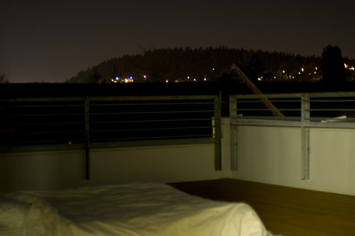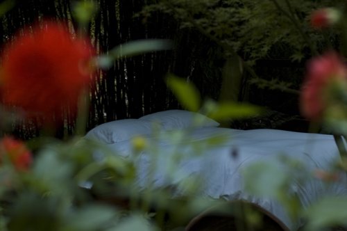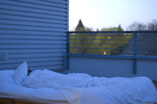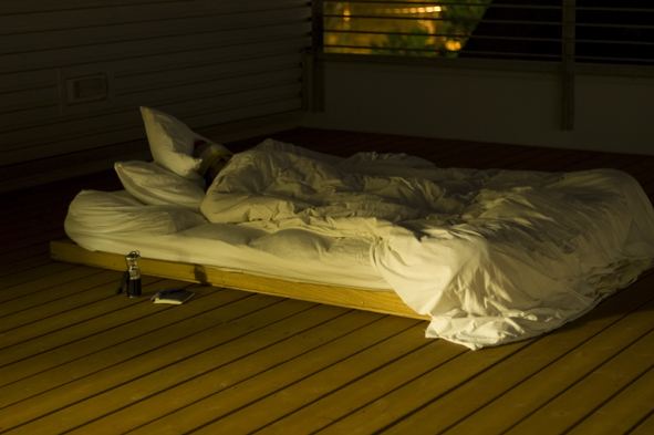 cotton futon bed dressed in warm white comforters, white featherbed, soft and clean white sheets, fluffy white pillows; handmade notebook, white with silver-gray ribbon and grid paper; black pen; lantern; white slippers; glass foot-washing basin with warm water and thick, white towel; various collaborators/experiencers; nighttime darkness; morning light